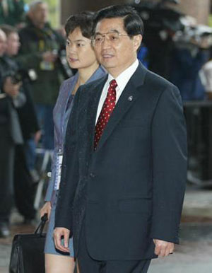 Chinese President Hu Jintao arrives at St. Isaac cathedral to attend the opening ceremony of the 300th anniversary of Russia's historic capital in St. Petersburg, Friday May 30, 2003. Vladimir Put