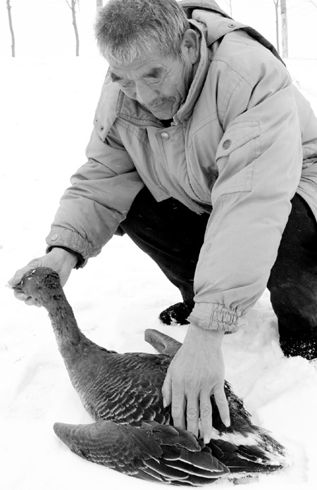 Zhang Huiduan finds a dead wild goose, which comes from the upper reaches of the river, at the Yellow River Wetland Reserve.