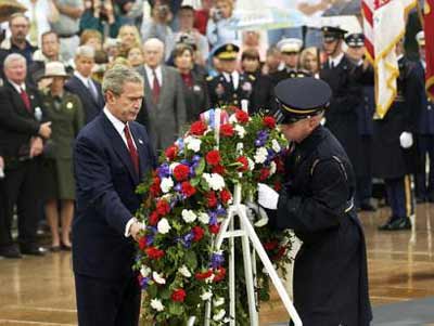 U.S. President Bush places a wreath during the Memorial Day ceremony at the tomb of the Unknown Soldier at Arlington National Cemetery in Arlington, Va. Monday, May 31, 2004. [AP Photo]