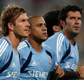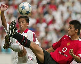 ![Manchester United's Dong Fangzhuo (L) and Park Ji-sung battle for the ball during a training session in Beijing July 25, 2005. Manchester United starts a four-day visit to China and will face Beijing Guoan in a friendly match at the Beijing Workers' Stadium on Tuesday. [Reuters]](xin_080702251717156200123.gif) Manchester United's Dong Fangzhuo (L) and Park