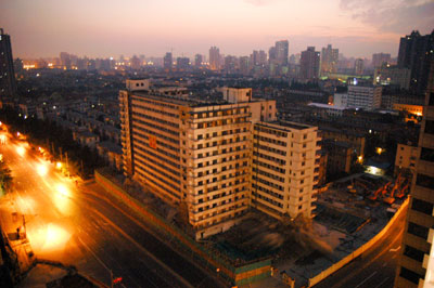Four tower blocks making up the Siping complex in Yangpu District of Shanghai are demolished in a controlled explosion in the early morning, October 20, 2005. The 17,000-square-meter complex was dismantled to make way for the construction of an urban transit hub. More than 400 households living in this 14-story complex, the first highrise residential building constructed in Shanghai, have been relocated. [newsphoto]