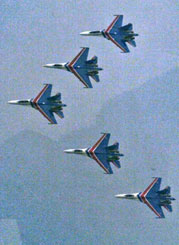 Five Russian SU-27 fighter jets perform during an aerobatics show at Zhangjiajie National Forest Park in Central China's Hunan Province Thursday March 16, 2006. [Xinhua]