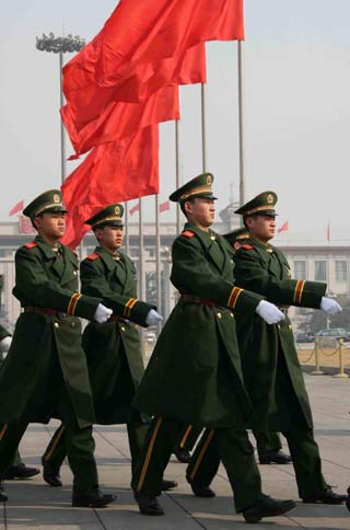 Soldiers patrol outside the Great Hall of the People
