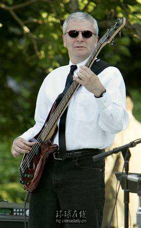隨后,博爾滕就和他的“同情者”樂隊(duì)(TheCompassionates)閃亮登場(chǎng)了。一頭灰白頭發(fā)的博爾滕摘掉了他平常戴的圓邊眼鏡,換上了一幅黑墨鏡,上身是白襯衣黑領(lǐng)帶,下身一條黑西褲,身背低音吉他,一副酷酷的味道。博爾滕在臺(tái)上非常投入,搖頭擺腦地演奏了好幾手搖滾樂。