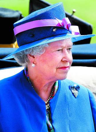 女王身穿品藍(lán)色縐紗外套配同色底粉紅蝴蝶結(jié)帽子。