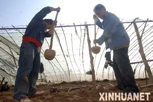 安塞縣沿河灣鎮(zhèn)侯溝門村兩位農(nóng)民在修建蔬菜大棚(11月4日攝)。新華社記者李曉果 攝