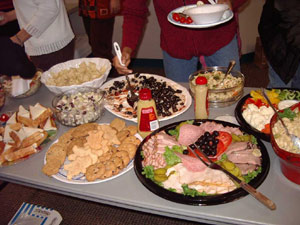 Potluck的第二層含義“聚餐”是美國一種特有的聚會形式——在某一個(gè)人或幾個(gè)人的提議下,大家舉行一個(gè)豐盛的餐會。有點(diǎn)像各家廚藝大比拼,餐會上各式各樣的菜肴由聚會者自帶,主人相對而言會輕松很多,除了備一個(gè)菜或一些飲料外,他的主要任務(wù)只是提供聚會場地。