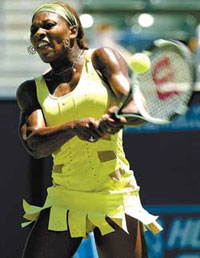 2005年1月17日,澳網(wǎng)女單首輪,小威身著新款網(wǎng)球裙。 裙子面料的紗網(wǎng)設(shè)計(jì),加大了透氣性。