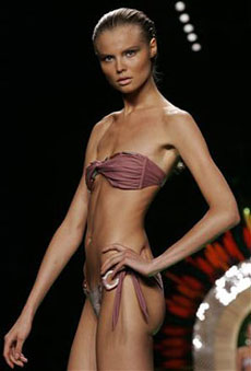 苗條并不是T型臺的永恒標(biāo)準(zhǔn)。西班牙馬德里政府近日發(fā)出禁令,禁止過于纖瘦的模特在本月底舉行的馬德里時(shí)裝周上走秀表演,原因是擔(dān)心她們給年輕的女孩傳遞“錯(cuò)誤的信息”。時(shí)裝周組織者認(rèn)為,一些女性觀眾會羨慕那些瘦骨嶙峋的模特而盲目減肥,導(dǎo)致飲食紊亂。這是時(shí)裝界首次對模特的體重進(jìn)行如此要求,馬德里政府希望此舉能鼓勵(lì)時(shí)裝秀展現(xiàn)模特們美麗健康的形象,而不是消瘦頹廢的“乞丐”或“吸毒者”。 |