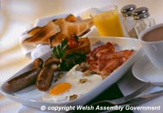 A Welsh breakfast is certainly a good way to celebrate St David's Day. Sausages from the local butcher, real dry-cured bacon, free range eggs, Penclawdd cockles and laverbread make up a regal feast. Welsh smoked salmon with scrambled eggs and laverbread is a lighter alternative.