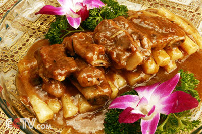 排骨年糕是上海一種經(jīng)濟(jì)實(shí)惠、獨(dú)具風(fēng)味的小吃,已有50多年歷史。上海有兩家著名的排骨年糕━━“小常州”和“鮮得來”?!靶〕V荨迸殴悄旮膺x用常州、無錫等地的豬脊骨肉,用醬油腌漬后,再放入用醬油、油、糖、蔥姜末、酒等混合的油鍋中氽,氽至色呈紫紅、肉質(zhì)鮮嫩、味道濃香時(shí)取出。與此同時(shí),將松江大米煮熟后,放在石臼里用榔頭反復(fù)捶打,待捶打至米已無整粒后取出,每500克切20根,每根里裹一小塊已經(jīng)氽過的排骨,再入醬汁油鍋中煮氽,吃時(shí),灑上五香粉,則既有排骨的濃香,又有年糕的軟糯酥脆,十分可口:“鮮得來”的排骨年糕是將面粉、菱粉、五香粉、雞蛋放在一起攪成浸裹在排骨表面,放入油中氽熟。這種排骨色澤金黃,表面酥脆,肉質(zhì)鮮嫩。與此同時(shí),將松江大米與紅醬油、排骨一起加上甜面醬,澆上辣椒醬即可。入口糯中發(fā)香,略有甜辣味,鮮嫩適口。上海市的曙光飲食店的“小常州”排骨年糕、“鮮得來”點(diǎn)心店作的排骨年糕最具特色。