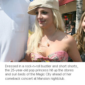 Dressed in a rock-n-roll bustier and short shorts, the 25-year-old pop princess hit up the stores and sun beds of the Magic City ahead of her comeback concert at Mansion nightclub.