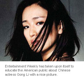 Entertainment Weekly has taken upon itself to educate the American public about Chinese actress Gong Li with a nice picture and a, "Ten Things You Didn't Know About Gong Li" article that lists the ten items Americans have no idea about Li.
