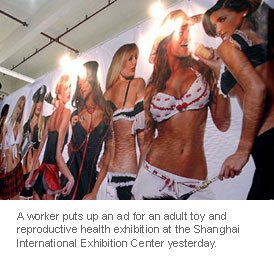 A worker puts up an ad for an adult toy and reproductive health exhibition at the Shanghai International Exhibition Center yesterday. The event will open today and runs through Sunday.