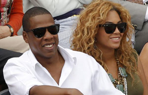 Jay-Z and Beyonce Knowles watch the men's final between Rafael Nadal of Spain and Robin Soderling of Sweden at the French Open tennis tournament at Roland Garros in Paris June 6, 2010.
