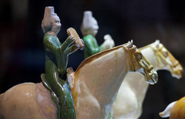 Visitors view tri-color glazed pottery artworks during a cross-Strait exhibition on tri-color glazed pottery of Tang Dynasty (618-907) in Taipei, Southeast China's Taiwan, Dec 4, 2015.