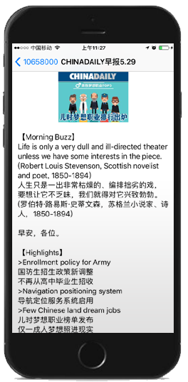 CHINADAILY mobilenews is a mobile phone-based bilingual news product.Every day it provides latest news from China and around the world, as well as quotable quotes, language tips and buzzwords.