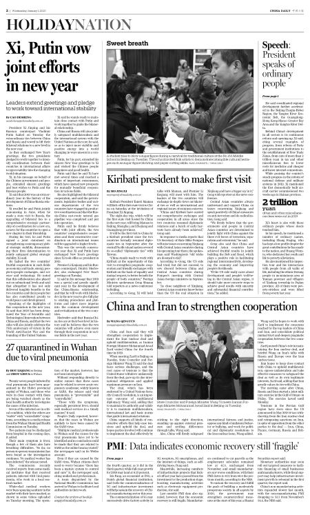 President Xi Jinping and his Russian counterpart Vladimir Putin hailed on Tuesday the extraordinary ties between China and Russia and vowed to lift their bilateral relations to a new level in the new year.