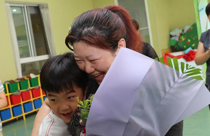 A kid who graduated from Hongshan Kindergarten goes back to the kindergarten to visit his teacher in Beijing, capital of China, Sept. 8, 2017. The Teachers' Day is celebrated in China on Sept. 10 every year. [Photo/Xinhua]