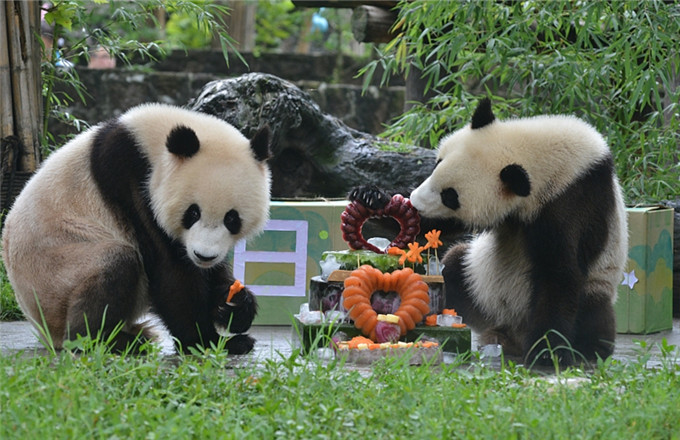 Panda twins Bingbing and Qingqing turned two on August 18. Staff at Dujiangyan giant panda protection center in Sichuan province where the pair live, held a birthday party and prepared special presents for them. Fans from around the world celebrated the party with them at the center.