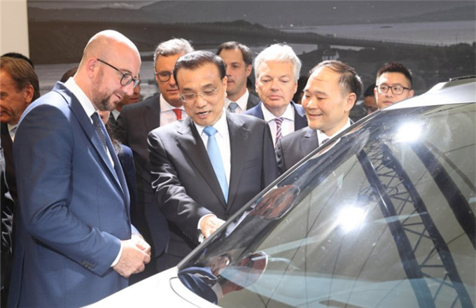 Premier Li Keqiang and Belgian Prime Minister Charles Michel stand next to a Volvo XC40 concept car at Val Duchesse castle in Brussels, Belgium, June 2, 2017.