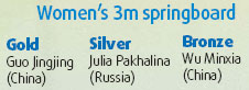 Her sixth Olympic medal, her fourth gold. In winning the women's 3m springboard finals yesterday, China's diving Queen Guo Jingjing has become the most decorated female diver in history. She surpassed the five medals of her predecessor Fu Mingxia, and tied Fu's four-gold haul. "I was fully prepared for the competition. I'm very happy to win and I'm satisfied with the result," said a calm Guo after the victory. "Fu is a very successful diver." In the final, Guo produced five consistent dives to claim the gold with 415.35 points. Russian veteran Julia Pakhalina claimed the silver with 398.60, followed by Guo's team-mate Wu Minxia with 389.85. Guo and Pakhalina had solid opening dives and were tied on 81 points. But the Russian made a poor second dive, and Guo opened up a nine-point lead. Her third dive won her the highest score of the day, 88.35, and extended her lead to 17 points. Pakhalina made up seven points after her fourth dive, but Guo sealed victory with a flawless fifth dive, scoring 85.50.