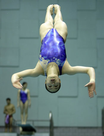 Chinese diver Wu Minxia trains with the national team in Jinan of east China February 28, 2007. The team has announced the roster for the coming World Swimming Championships in March in Melbourne of Canada. [Xinhua]