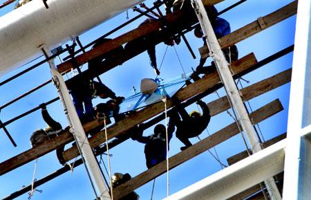 Workers install the glass roof of the Shenyang Olympic Sports Center in Shenyang, northeast China's Liaoning province on March 12, 2007.[Newsphoto]