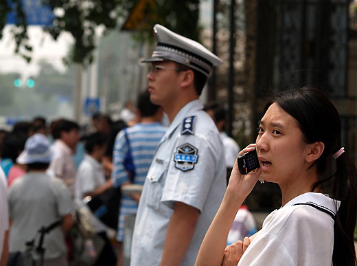 A student uses cellphone after finishing her first exam - by Zou Lao in June of 2007.