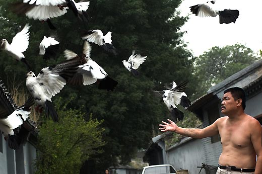 Making life of riding pedicab: the man and his pigeons - by Du Shan in 2006