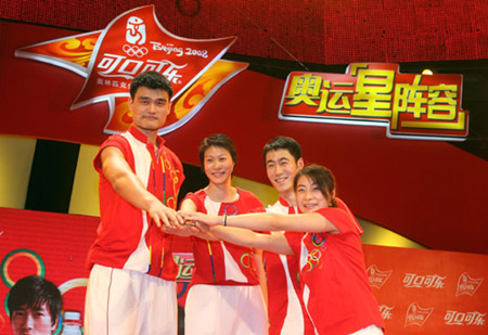 Beijing 2008 Olympics sponsor Coca Cola holds a news conference to promote upcoming Olympic torchbearers selection event, which Chinese NBA star Yao Ming(L), "diving queen" Guo Jingjing(R), top table tennis player Wang Liqin,second right,and other well-known Chinese athletes attend on July 3rd, 2007 in Beijing.[sina.com]