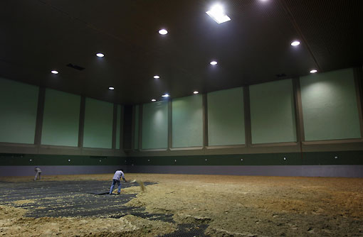 | A worker fills up an indoor training arena with treated sand for the equestrian event of the Beijing 2008 Olympic Games near Shatin race track in Hong Kong July 7, 2007. [Reuters] |