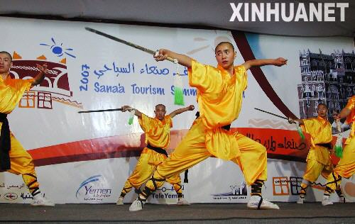 Chinese performers demonstrated Chinese martial arts in Yemen on Tuesday, July 17, 2007. Hundreds of local audience in Sana'a were attracted to the oriental exciting kung fu performances, brought by visiting martial arts team from Beijing's Shaolin Martial Arts School. [Xinhua]