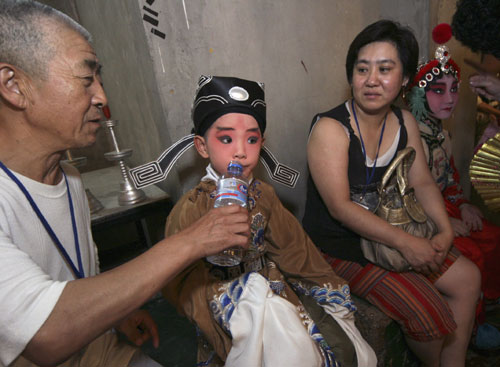 A participant waits backstage ahead of a child Peking Opera competition in north China's Tianjin municipality July 31, 2007. About 50 children from all parts of China will take part in the competition, which lasts for three days from July 31, according to local media. [Reuters] |
