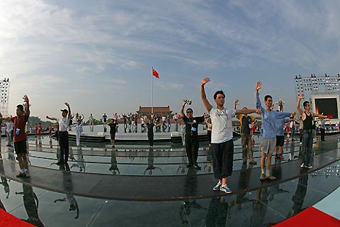 Chinese dancers perform during the rehearsal of one-year countdown celebration for the 29th Olympic Games in Tiananmen Square in Beijing August 8, 2007. [BOCOG]