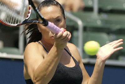 | Jelena Jankovic of Serbia, returns a shot to Shuai Peng of China, during their match in the East West Bank Classic tennis tournament at the Home Depot Center in Carson, Calif., Wednesday, Aug. 8, 2007. [Xinhua] |