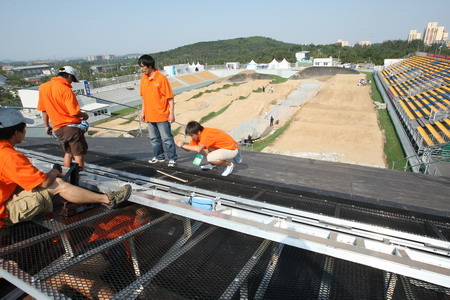 Workers make final inspections at the starting point before athletes try out the venue. |