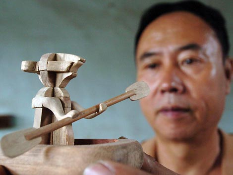 Sha Yingkui, a Tianjin-based craftsman, holds a wooden rat in a kayak on September 26, 2007. Sha made a set of rat dolls practicing all the Olympic sports without using nails or glue. [Xinhua]