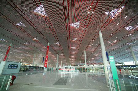 An interior view of the newly-built Terminal 3 (T3) of Beijing Capital International Airport (BCIA), November 21, 2007. T3A, the major building of Terminal 3 is now completed. The new terminal will serve Olympic and Paralympic chartered flights during the Games. [Xinhua] |