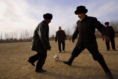 Senior villagers from North China's Xinjiang Uygur Autonomous Region play football during a training session December 26, 2007. The village has fielded a football team for senior men aged from 50 to 88, who do on-court workouts three times a week in the village's school yard. [Xinhua]