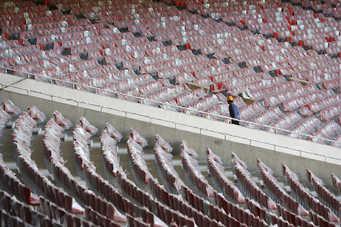 A worker walks past chairs inside the National Stadium, also known as the Bird's Nest, in Beijing January 1, 2008. China said its centuries of culture and history would light up the world during the 2008 Olympic Games. [Agencies]