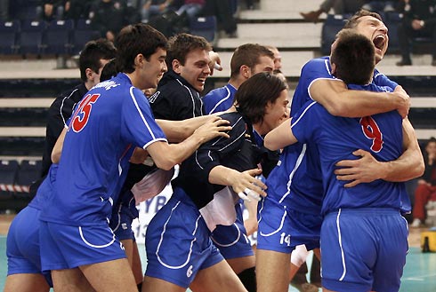 Serbian players celebrate their victory over Spain in their 2008 Olympic Games European Qualification volleyball match final at Halkapinar Sport Hall in Izmir January 13, 2008. [Agencies]