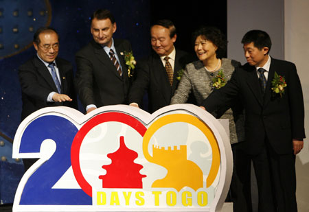 Government representatives, sponsors and sports officials attend a ceremony to unveil the official uniforms of volunteers, technicians and referees of the Beijing Olympics and Paralympic Games in Beijing January 20, 2008. The event also marked the 200th day before the Olympics Games which opens on August 8, 2008. [Agencies]