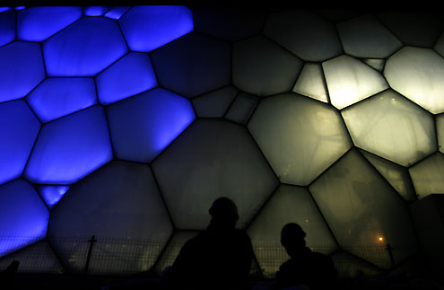 Two labours work outside the National Aquatics Centre, also known as the Water Cube,which is lit by blue lights at night in Beijing January 19,2008. The centre, built for the Beijing Olympics, will host its first event - the "Good Luck Beijing" Swimming China Open - from January 31 to February 5. [Agencies]
