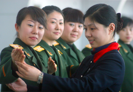 Women frontier inspectors of Shenyang General Station of Exit and Entry Frontier Inspection accept gesture training in Shenyang, Northeast China’s Liaoning Province, January 21, 2008. The women inspectors receive all kinds of etiquette trainings such as standing, walking and smiling for the upcoming 2008 Beijing Olympic Games. [Xinhua]
