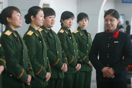 Women inspectors practice standing poses as they receive etiquette trainings. [Xinhua]