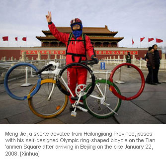Meng Jie, a sports devotee from Heilongjiang Province, poses with his self-designed Olympic ring-shaped bicycle in front of the National Grand Theatre after arriving in Beijing on the bike January 22, 2008. Meng left Yinchuan of Northwest China's Ningxia Hui Autonomous Region at the end of last October for his nationwide tour to promote Olympic spirit. [Xinhua]