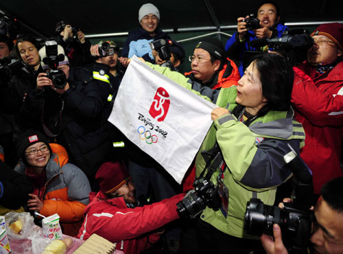 Journalists celebrate at the base camp at the foot of Mt. Qomolangma after the Olympic torch reached the peak on Thursday morning. [Xinhua]