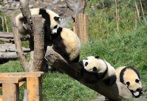 Four giant pandas frolic inside their enclosure in Wolong Panda Reserve in quake-stricken Sichuan Province on May 23, a day before leaving for Beijing. [Xinhua]