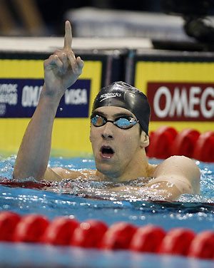 Michael Phelps celebrates his win and new world record in the Men's 400m Individual Medley at the US Olympic Swimming Trials in Omaha, Nebraska, June 29, 2008. [Agencies]